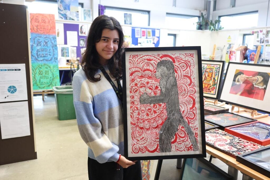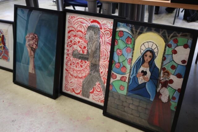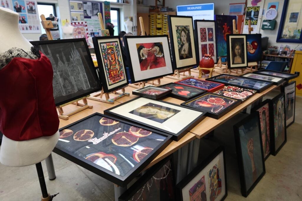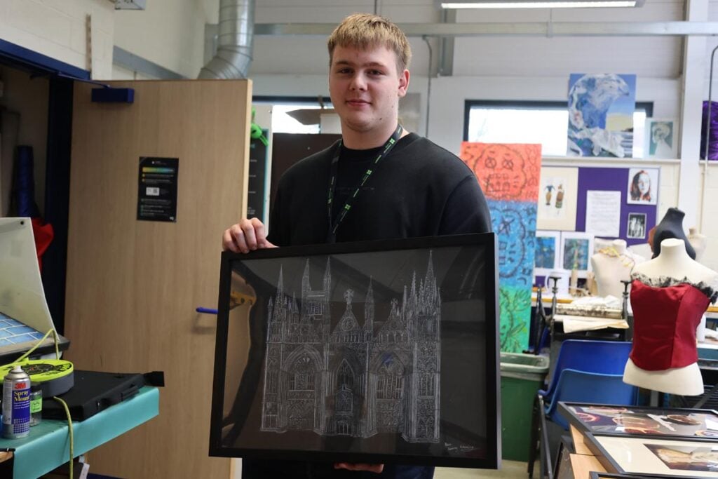 Speaking about the experience, Daniela Dobrota, Level 3 Art and Design student.“I found the live brief really interesting. It was challenging at first, particularly deciding how to approach the canvas, but as we learned more about Katherine of Aragon, and when staff from the Cathedral visited to share further insight, my ideas began to develop. Discovering details about her life helped everything come together and gave me a clear creative direction.”