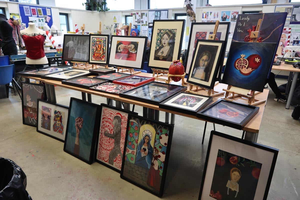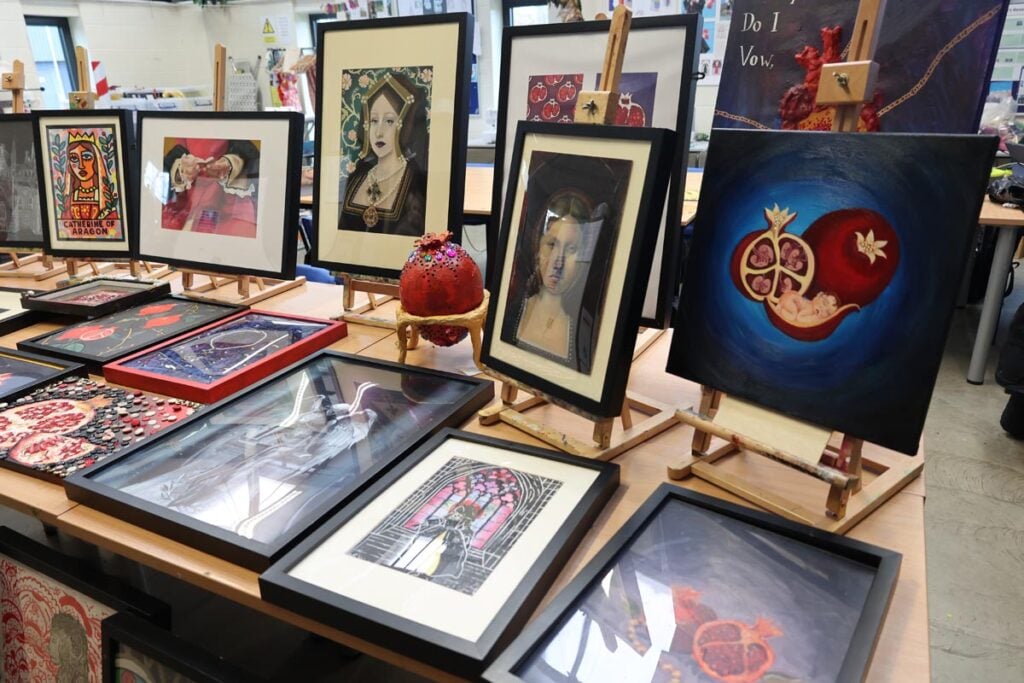 The project, commissioned by Toni Morgan-Ray, Learning Officer at Peterborough Cathedral, formed part of the preparations for the Tudor banquet celebrating the life and achievements of Katherine of Aragon. Learners from Levels 1 to 3 Art and Design produced an extensive collection of Katherine-inspired artwork, which has now been collected and will be installed within the Cathedral ahead of the festival.