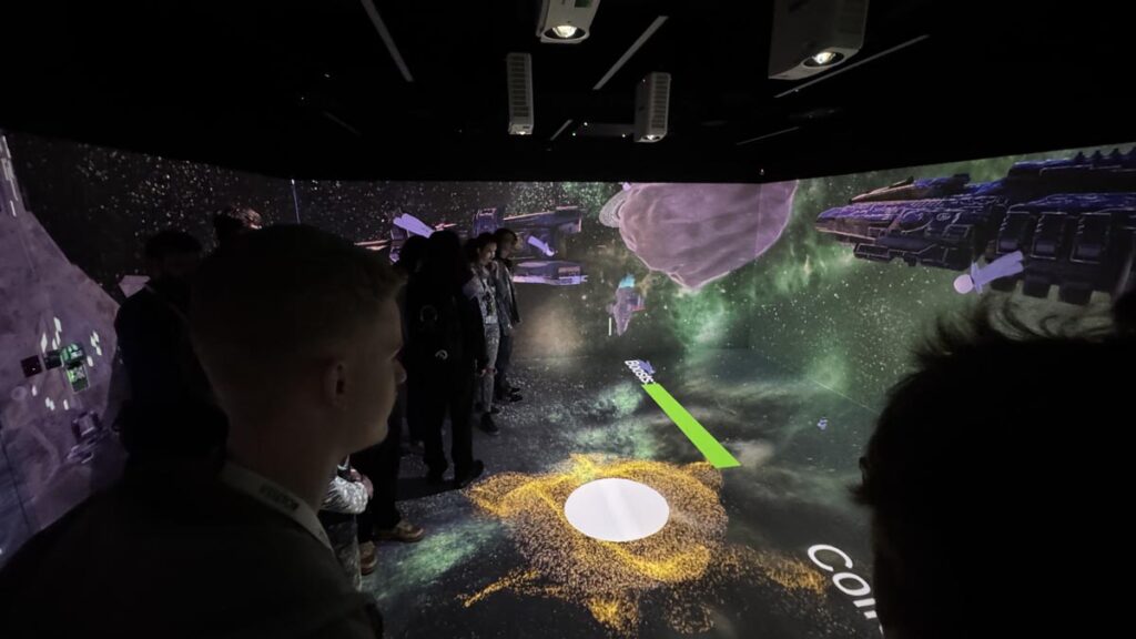 The visit began with a guided tour of the campus, highlighted by a session in the university’s immersive volume room. This gave the college students a chance to step inside room-scale projects, seeing firsthand how the technical concepts they study in the classroom translate into large-scale, interactive environments.