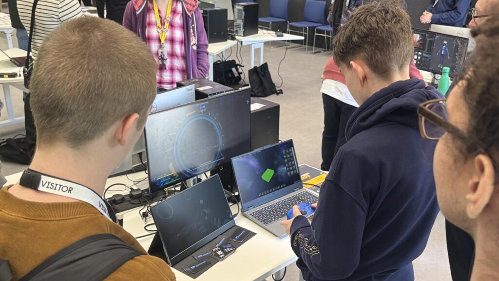 The day continued to the showcase, where the Game Design students met with final-year university students to discuss their work and the reality of the degree experience. The group explored a wide range of impressive specialisations, including a terrifying VR horror game, a galactic exploration title powered by procedural generation, and technical demonstrations of motion-captured characters and advanced weapon mechanics.