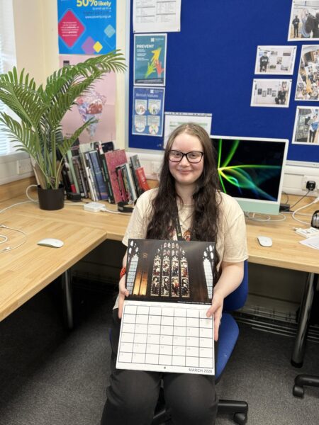 Cami’s image. A striking photograph of a stained-glass window has been given for March. This was taken early in her course as she began to explore her personal style. Cami said,“ I took the photo last year when I was first starting Photography and learning how to use the camera. I’ve discovered that I really like darker, moodier imagery. I was originally there to take photos of a person in front of the stained glass, but when I saw that window, I knew I had to capture it. I also love that I could focus just on the window itself.”